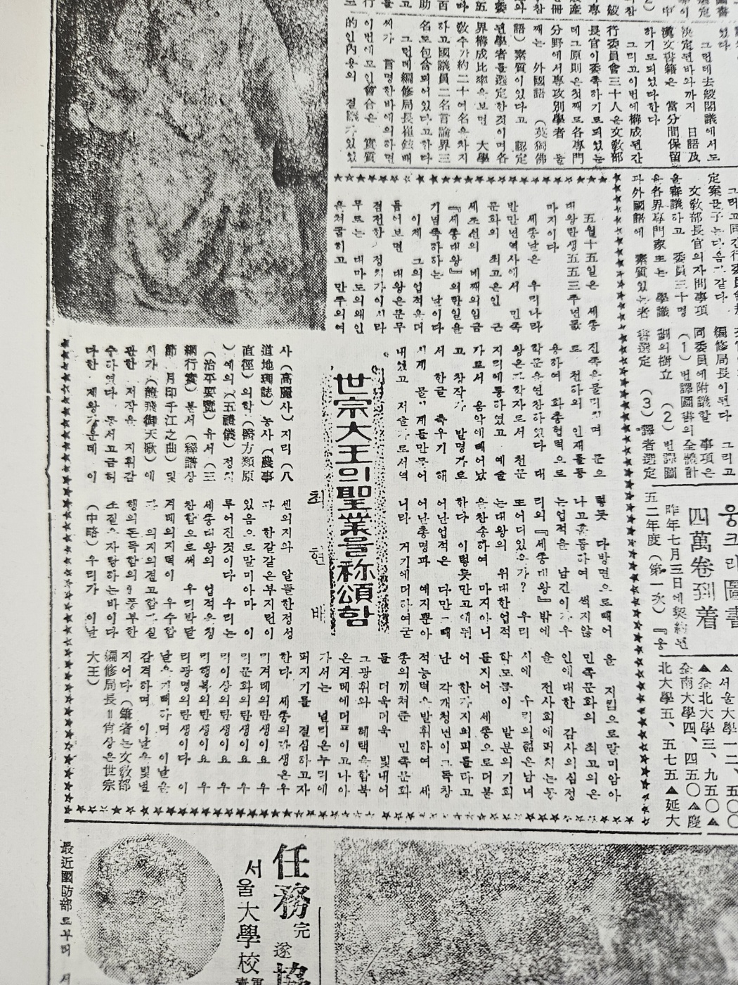 1953년 5월 18일자 기사이고 기사제목은 <세종대왕(世宗大王)의 성업(聖業)을 칭송(称頌)함>이고