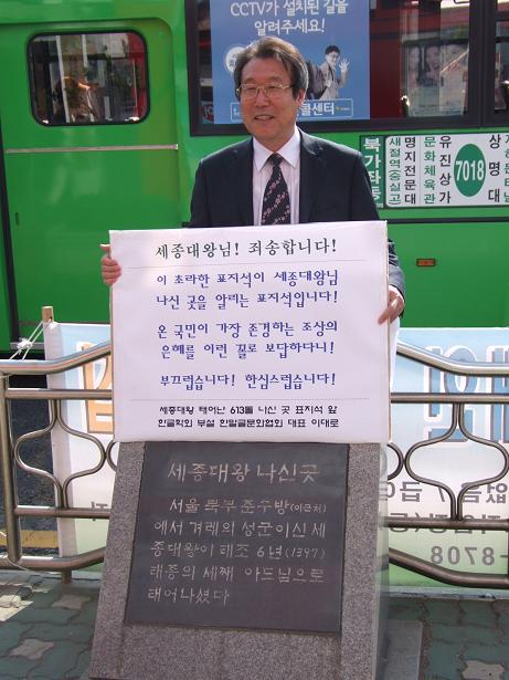 저는 국경일이 된 한글날을 온 국민이 참여하는 큰 잔칫날로 만들어 자긍심을 키우고 다지는 기회로 삼고 싶고, 임이 태어난 곳을 찾아 탑골공원처럼 만들어 국민 정신교육장으로 만들고 싶고, 한글문화관도 거창하게 지어 세계 언어 문자 중심지로 만들어 잘 사는 나라의 토대를 다지고 싶은 데 정치인과 공무원은 말할 거 없고 국민이 한 마음이 안 되어 제대로 진행되지 않습니다. 외국에선 임보다 못한 인물이 태어난 곳이나 유적을 관광자원으로 활용하는 데 우리는 임의 태어난 곳 근처 길가에 조그만 표지석만 초라하게 있습니다. 선진국을 바라보는 나라의 임자로서 참으로 안타깝고 부끄럽습니다.