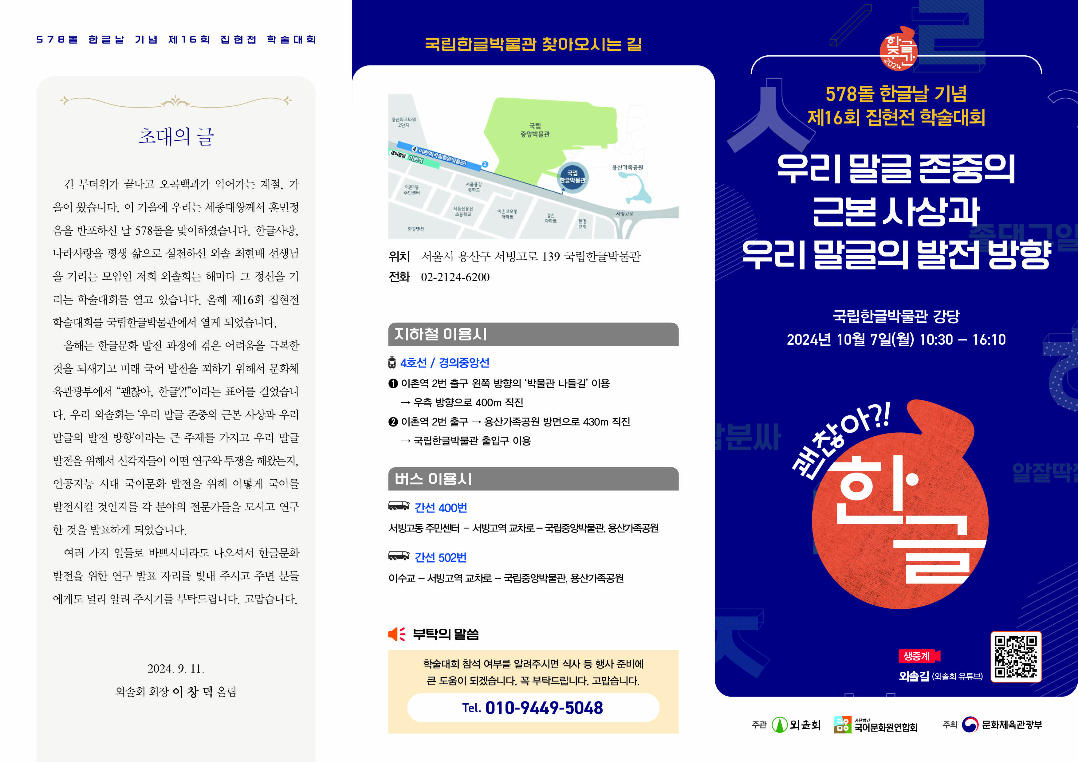 578돌 한글날 기념 제16회 집현전 학술대회(10/7.월)